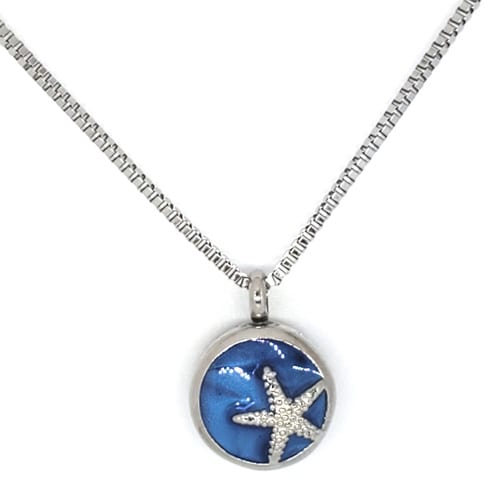 Starfish pendant with small stones the color of small diamonds on a blue enameled background, made of a silver-colored metal alloy.